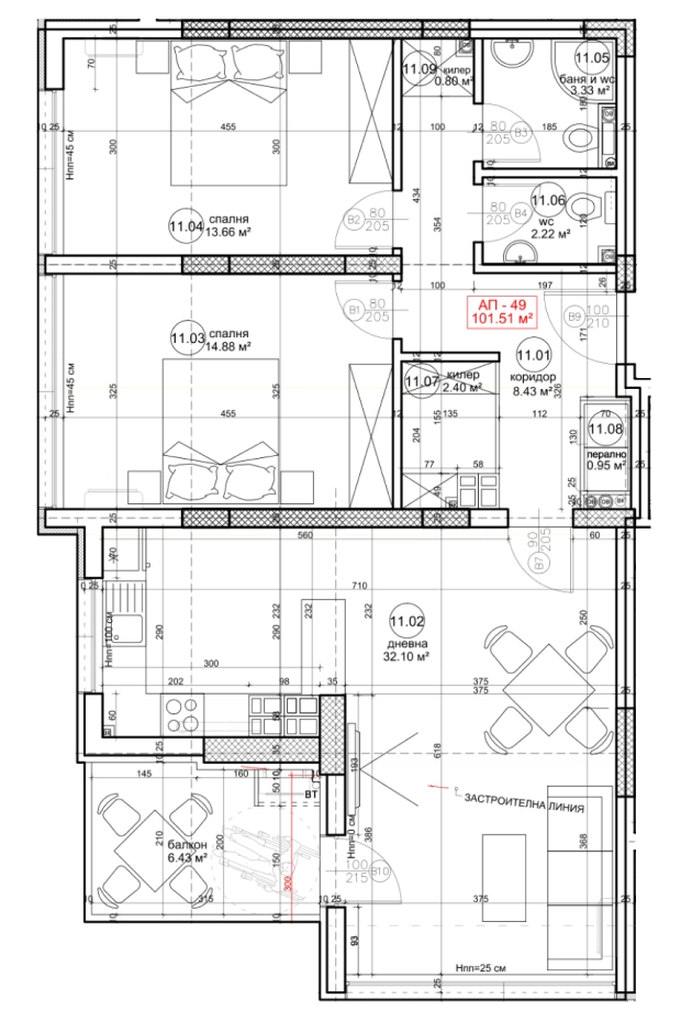 Kоридор, дневна с кухненски бокс, две спални, два килера, баня- тоалет, тоалет, перално, балкон