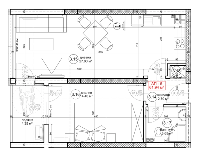 Коридор, дневна с кухненски бокс, спалня, килер, баня- тоалет и лоджия